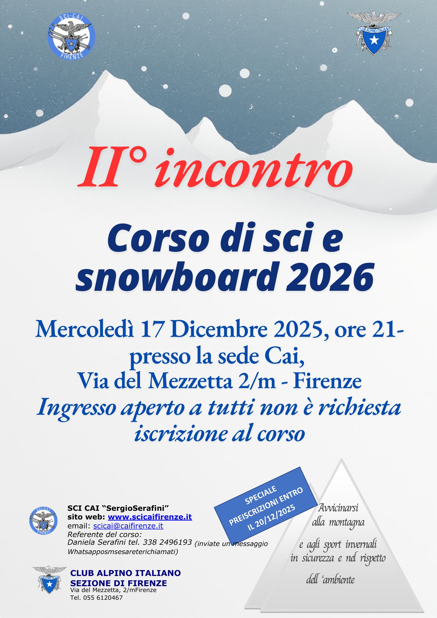 Mercoledì 17 Dicembre alle ore 21, in via del Mezzetta 2/m, presso la sede del Cai Firenze, si svolgerà il secondo incontro teorico di presentazione del Corso di sci e snowboard 2026. Chiunque è interessato può partecipare, la presenza non richiede poi l'iscrizione al Corso. E' possibile partecipare anche da remoto chiedendo il link a Questo indirizzo email è protetto dagli spambots. È necessario abilitare JavaScript per vederlo.